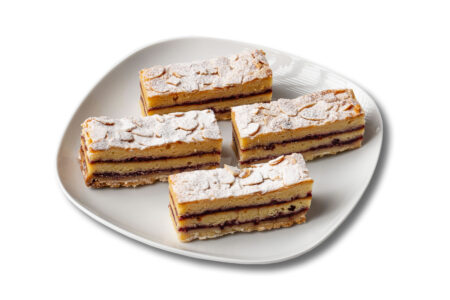 Butter shortbread base layered with raspberry jam and almond frangipane. Finished with toasted almonds and dusting sugar. (available in : Box of 6 only)