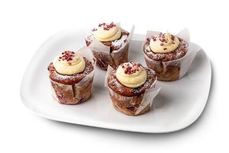 A light fluffy almond meal muffin base mixed with tangy raspberries and white chocolate chips finished with a velvety white chocolate ganache and freeze dried raspberries.